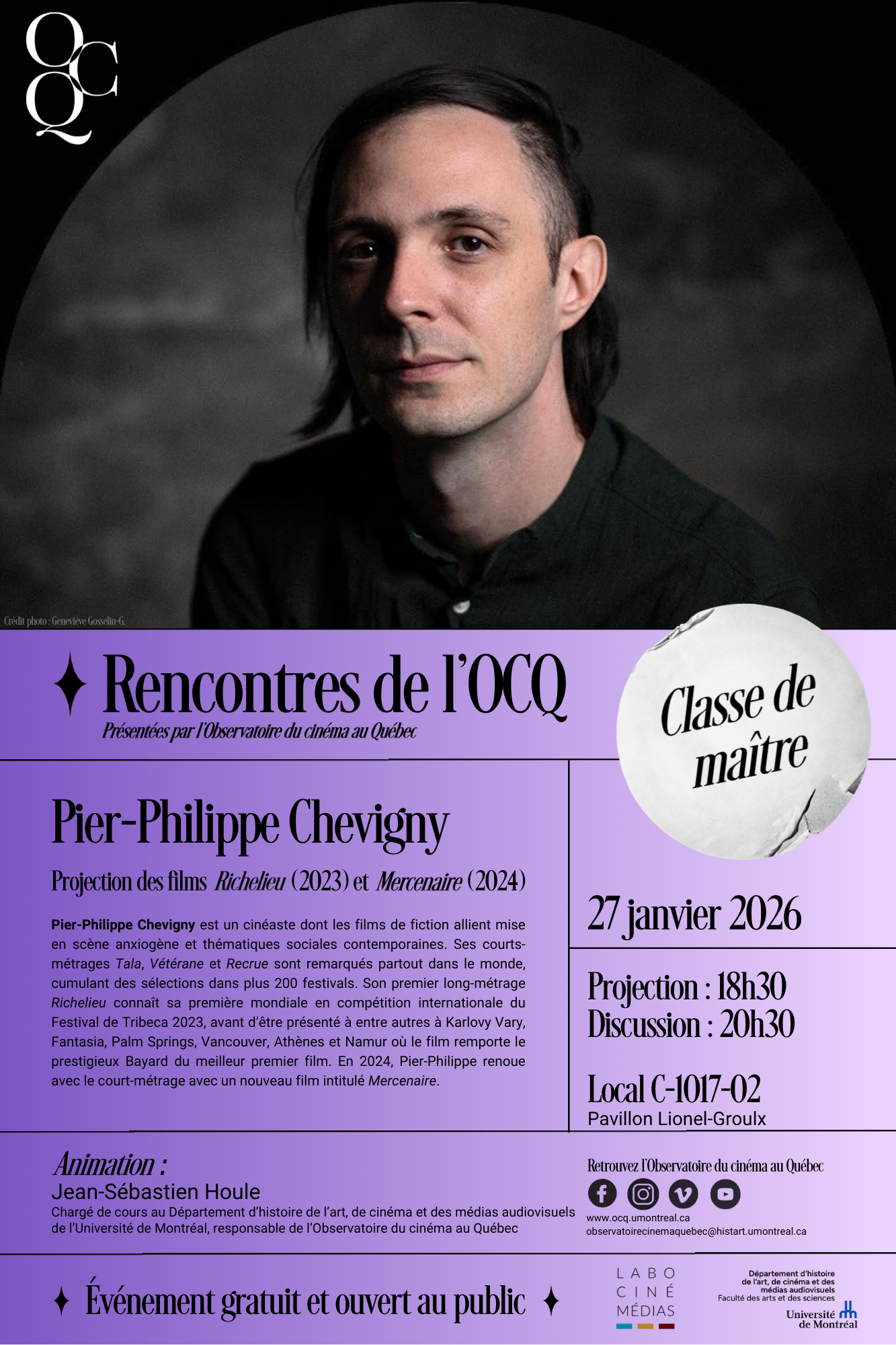 Classe de maître avec Pier-Philippe Chevigny Voir l'image agrandie Quand ? 27/01/2026 6:30 — 9:30 Où ? SALLE C‑1017 – 02, Carrefour des arts et des sciences Quoi ? Classe de maître OCQ Mardis OCQ grafics2026-01-20T16:41:36-05:00